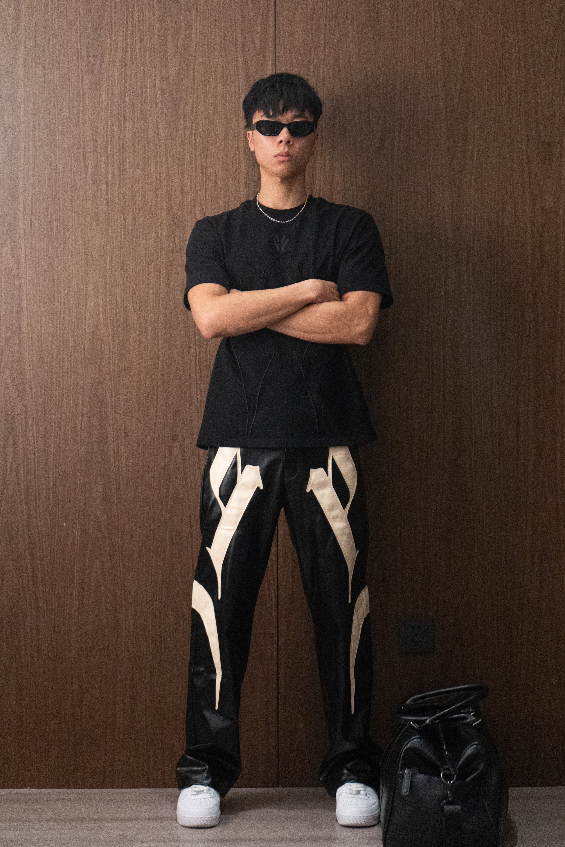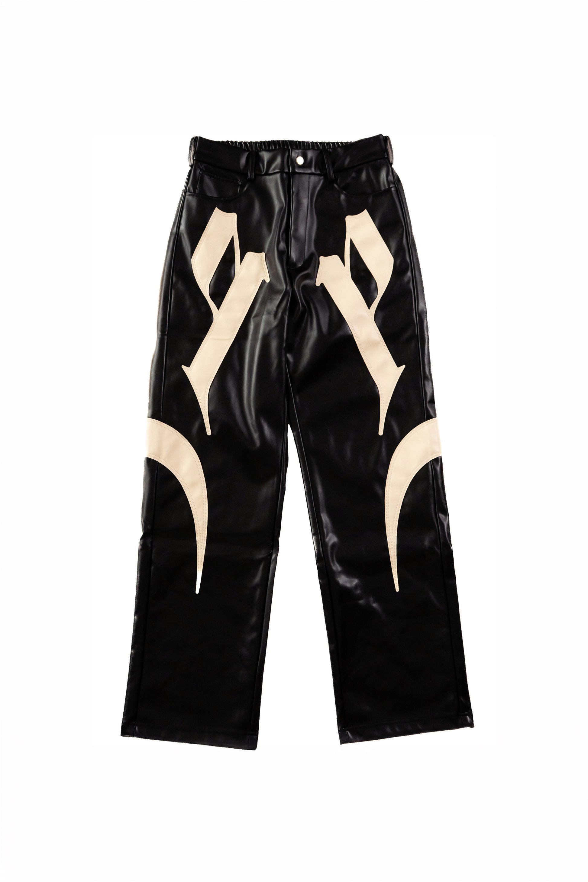 Our iconic faux leather trousers features bold appliqué patterns inspired by our signature SUNDOWN T-Shirt. Cut from a custom faux leather blend with a matte grain finish, and lined with a feather-light fleece that sits softly against the skin.